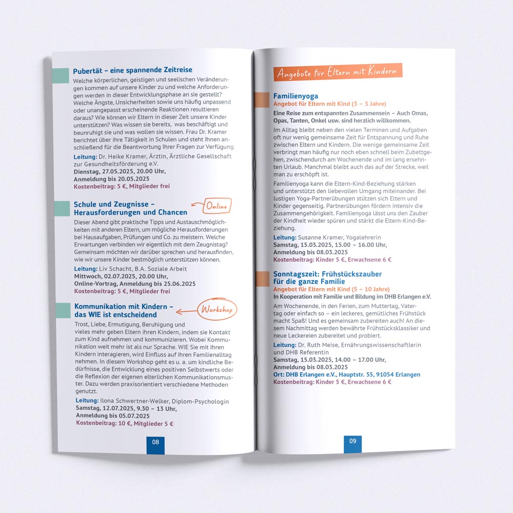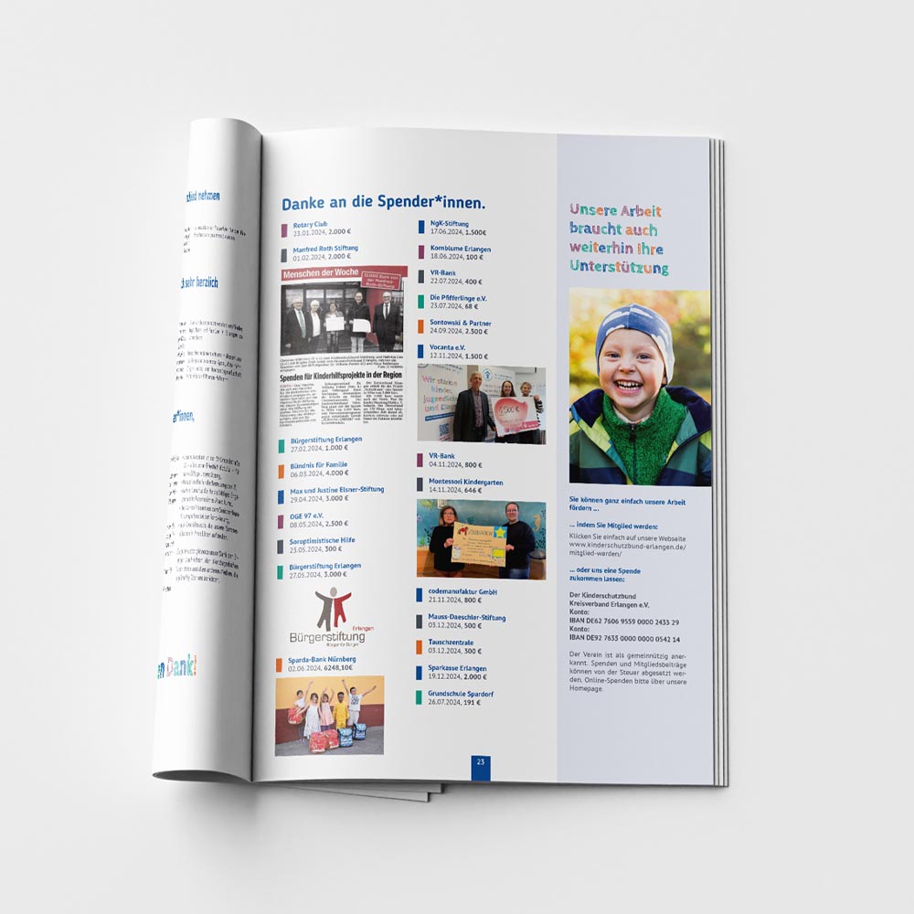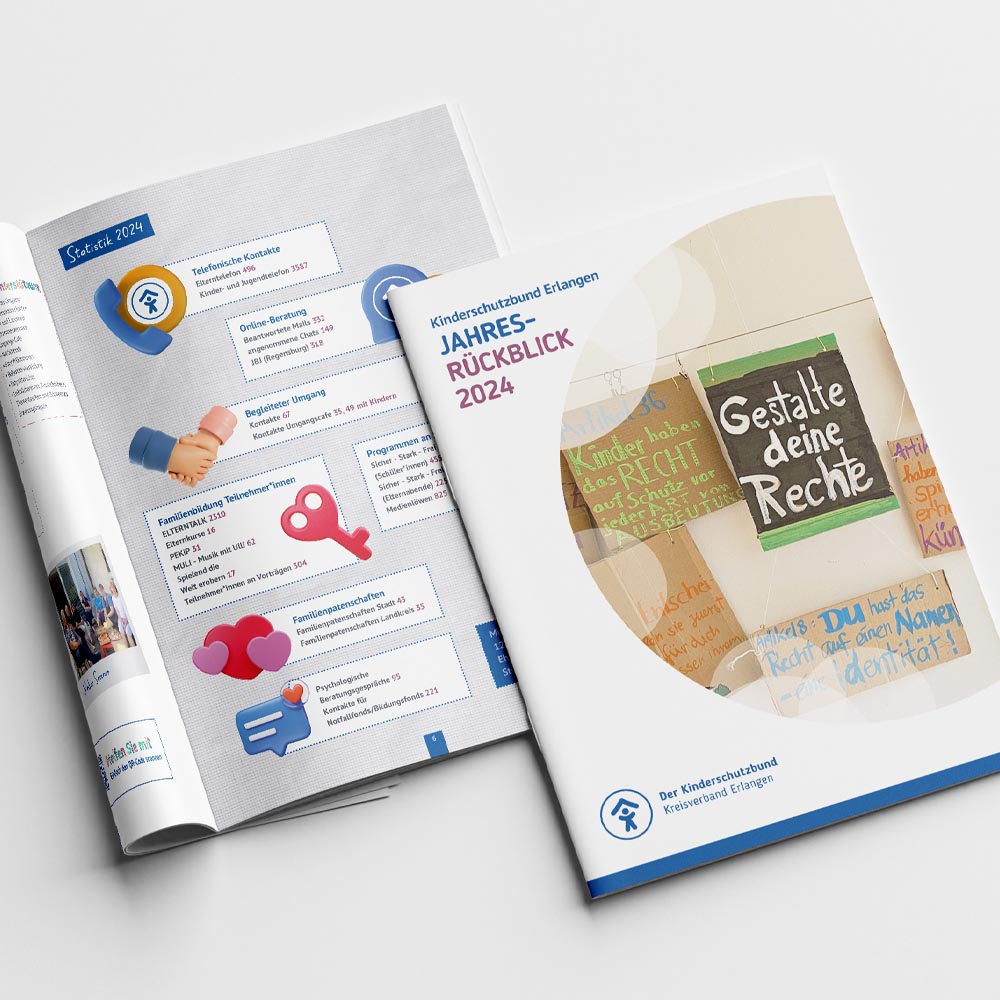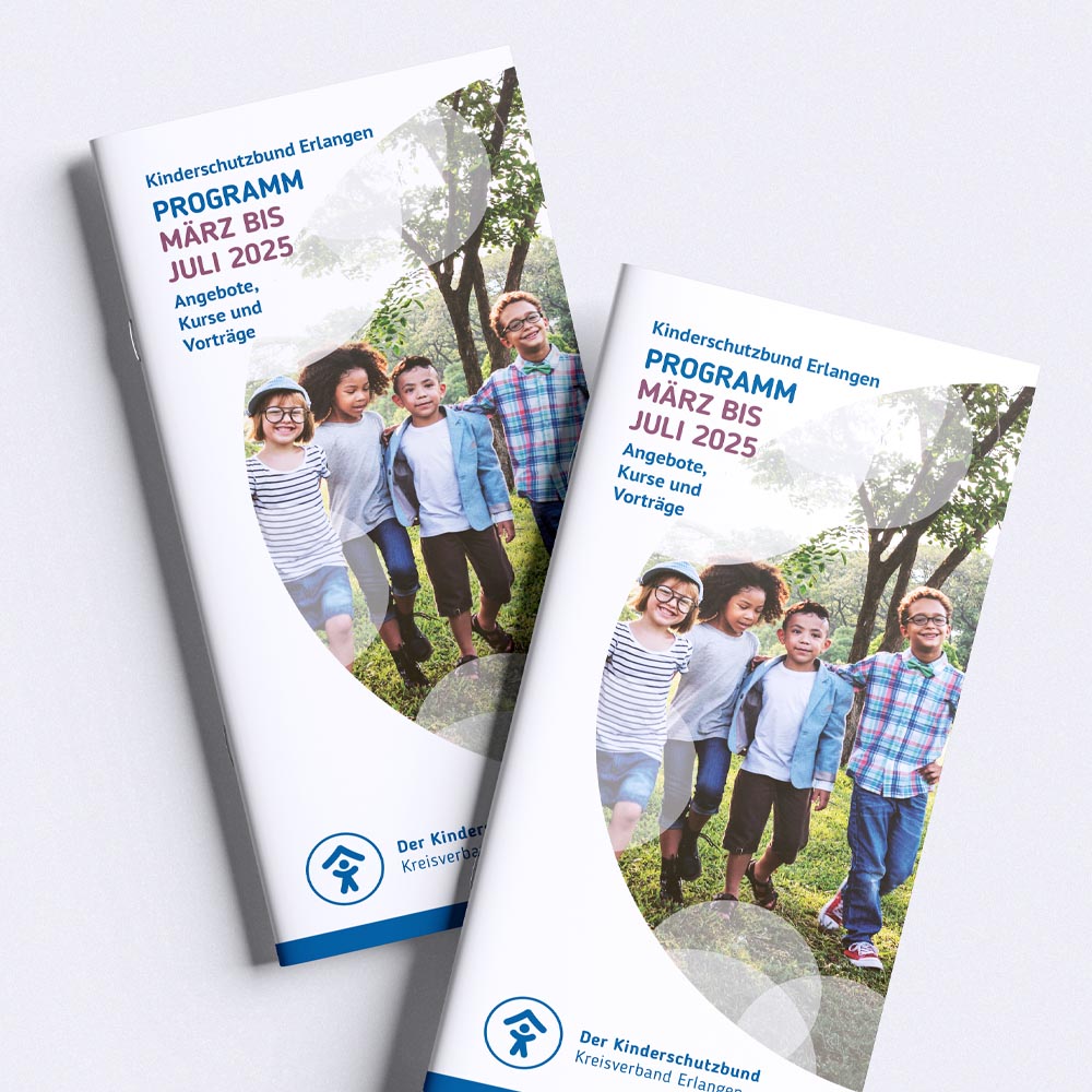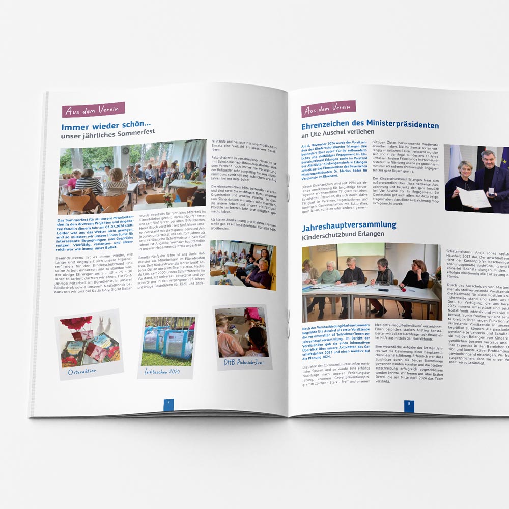 In enger Zusammenarbeit mit dem ehrenamtlichen Team des Deutschen Kinderschutzbund Erlangen, wurden die zweimal jährlich erscheinende Programmbroschüre und das Jahresrückblick-Magazin komplett überarbeitet.