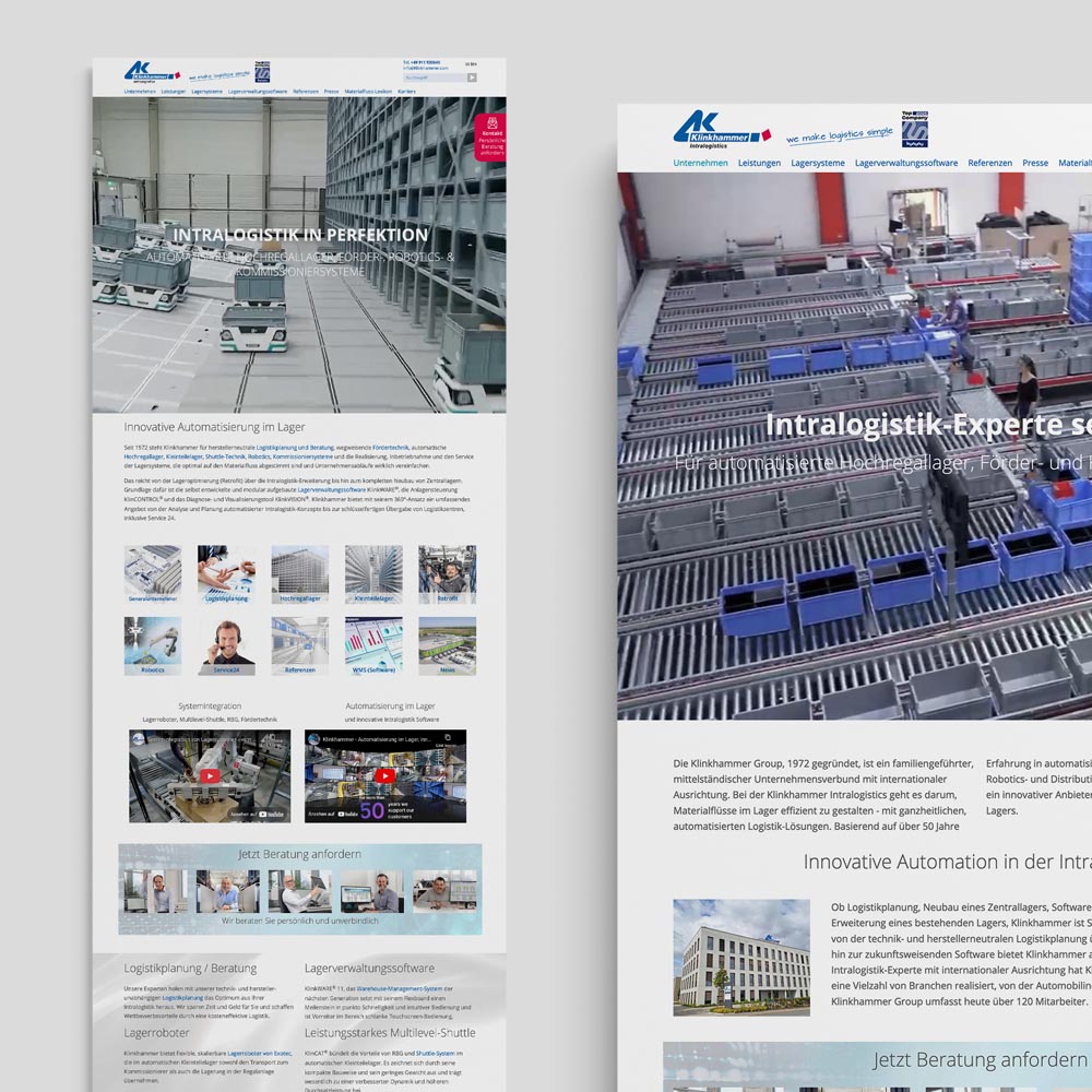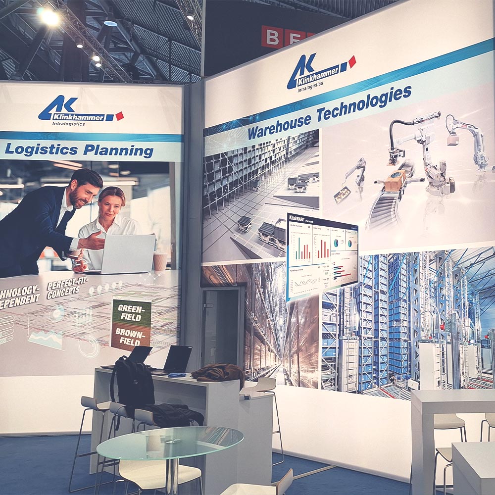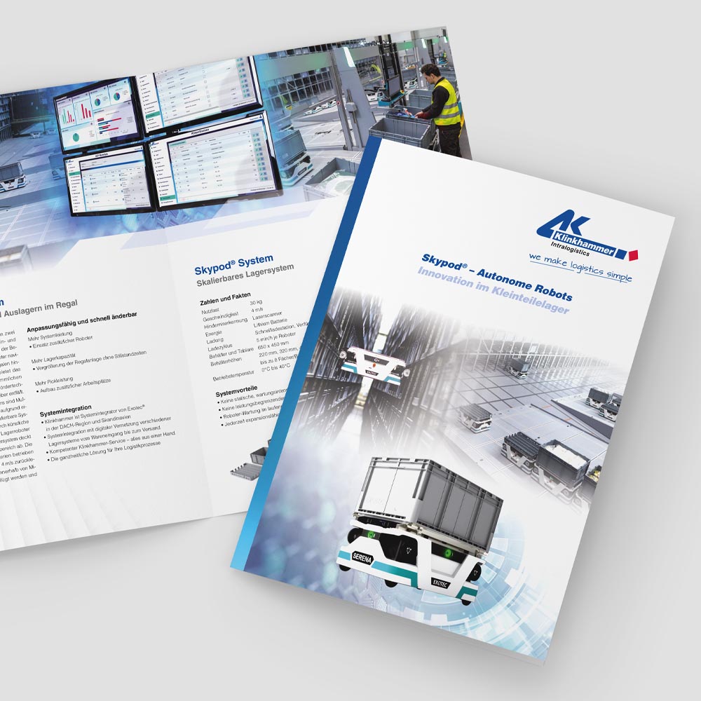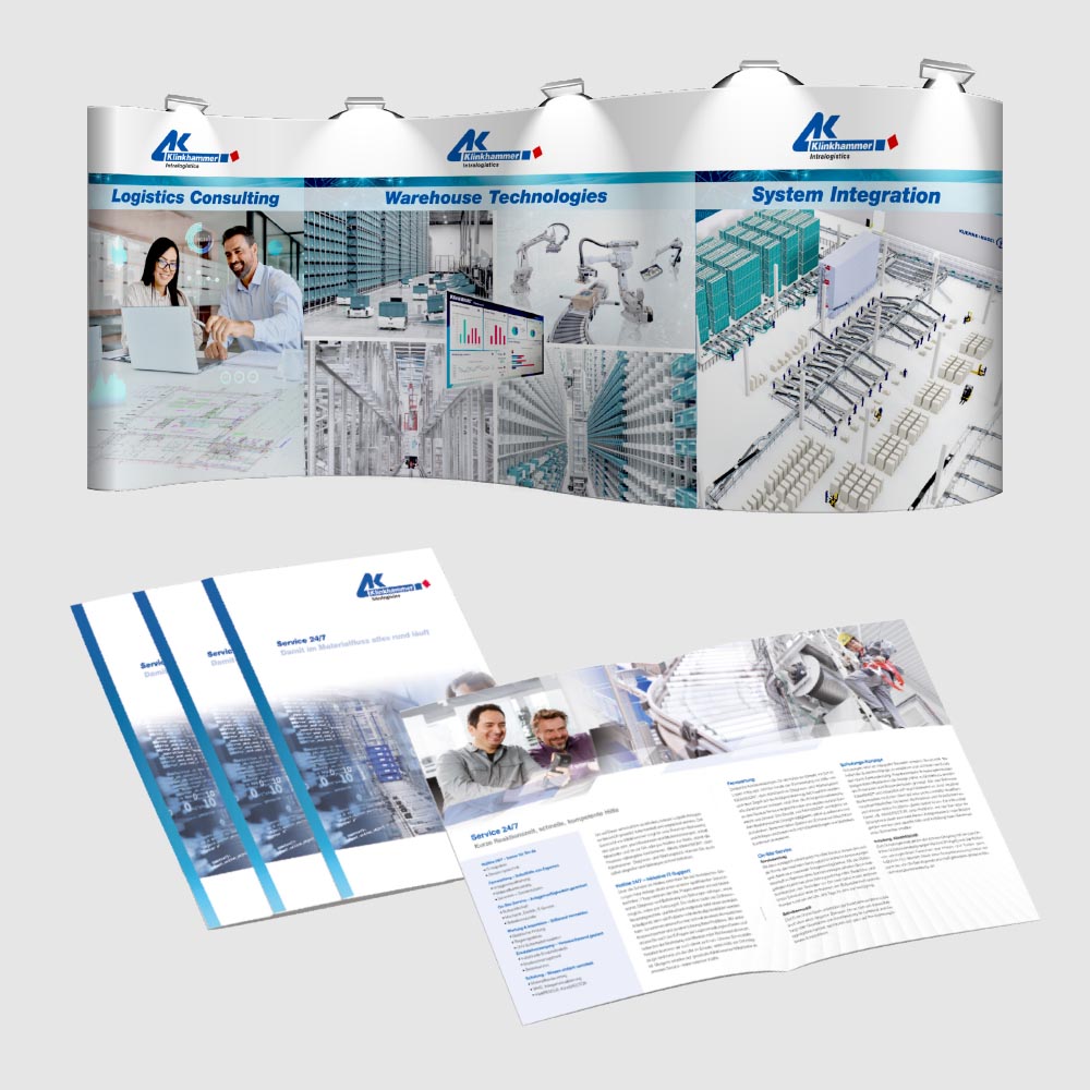 Vom Web- und Corporate Design über aufmerksamkeitsstarke Anzeigen, digitale Display-Ads, prägnante Produktflyer und -broschüren bis hin zum durchdachten Messestand – alle Maßnahmen folgen einem klaren, konsistenten Gestaltungskonzept. Ziel ist es, die technische Kompetenz und Systemlösungen von Klinkhammer wirkungsvoll zu präsentieren – analog wie digital. Die Klinkhammer Group ist seit 1972 Spezialist für automatisierte Hochregallager, Förder- und Kommissioniersysteme. Neuerdings auch in Robotics- und Distributionstechnik und eines der führenden Intralogistik-Unternehmen mit vielen Kunden aus allen Branchen in Europa.