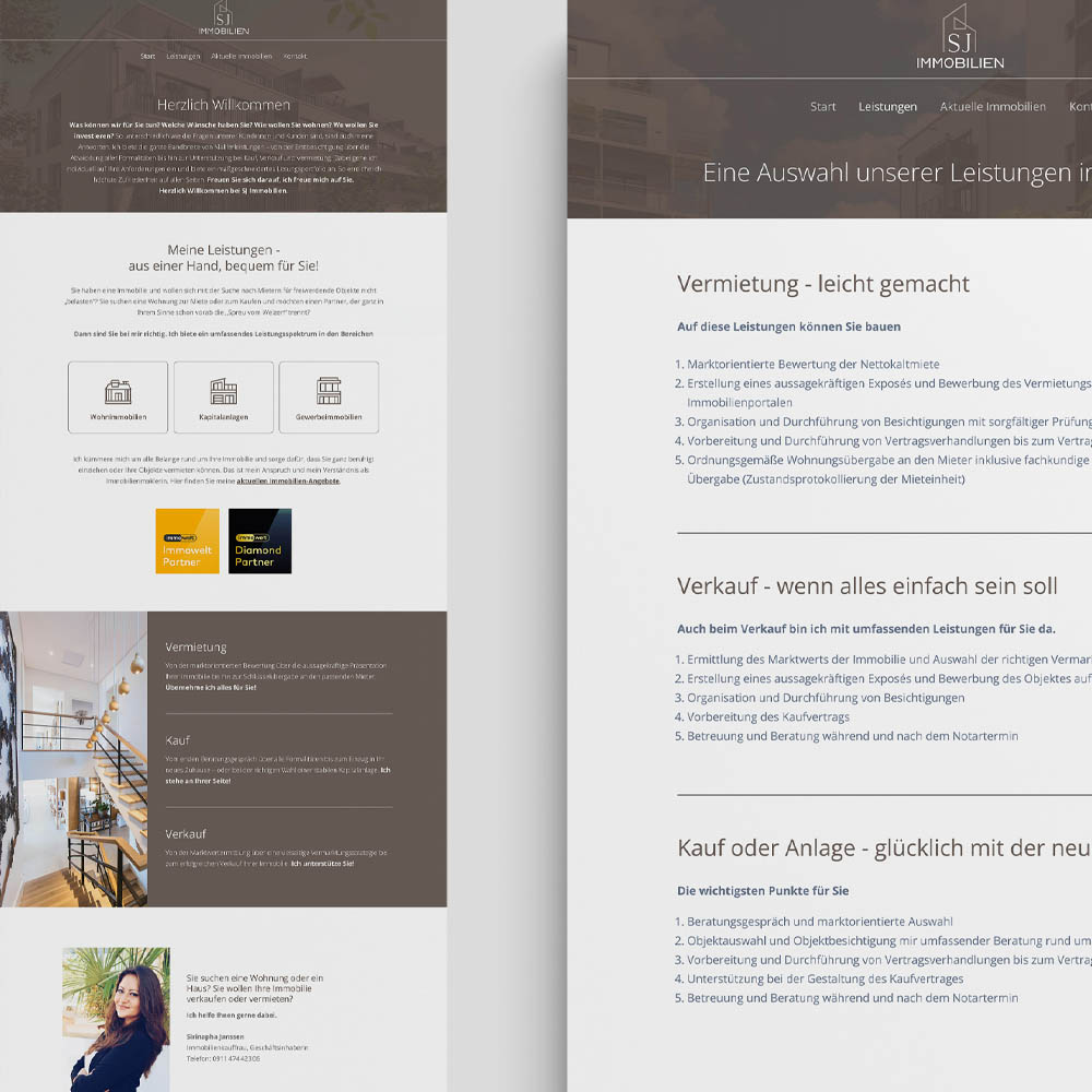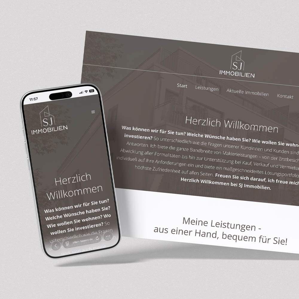 Ergänzend wurde eine moderne WordPress Website umgesetzt. Die Website ist übersichtlich strukturiert, responsiv für alle Endgeräte optimiert und suchmaschinenfreundlich aufgebaut. Ziel war ein professioneller Online-Auftritt, der die Leistungen von SJ Immobilien klar präsentiert und Vertrauen bei potenziellen Kundinnen und Kunden schafft.